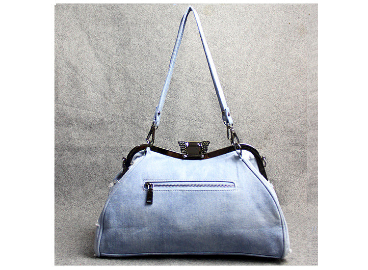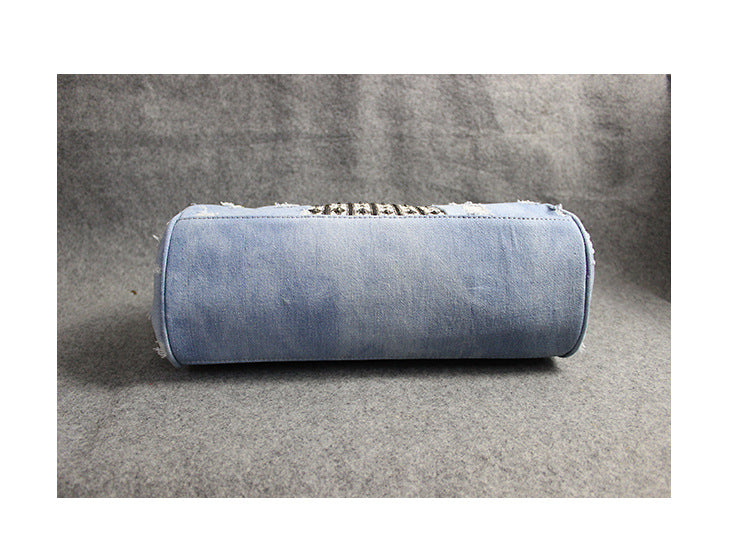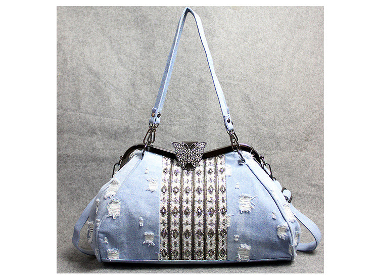 Take on a daring adventure with our Butterfly Diamond Denim Bag! Featuring a unique butterfly design made of sparkling diamonds, this bag is perfect for those who love to stand out. The light blue denim adds a touch of casual coolness while the crossbody style allows for hands-free motion. Make a bold statement with this bag!