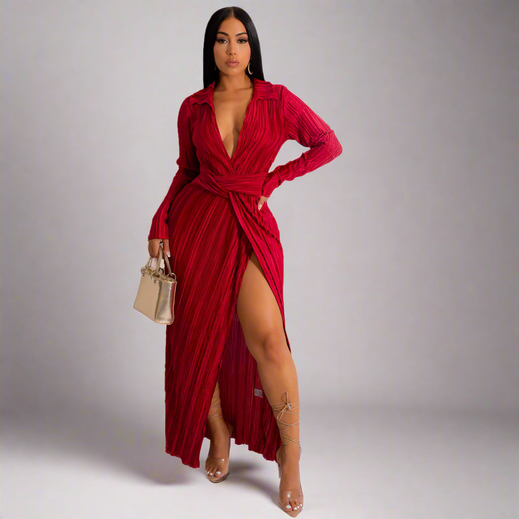Step out in style with the Slit Pleated Wrap Dress, designed to twirl and flow with every move. Its playful pleats add a flirty texture, while the wrap silhouette flatters your figure effortlessly. The daring slit brings a touch of sass, making this dress perfect for days when you want to feel confident and fun. Whether it’s a brunch date or an evening out, this dress promises to keep you looking chic and lively.